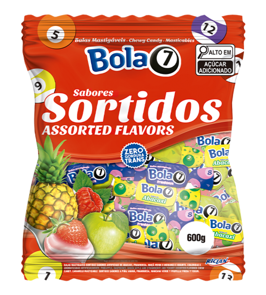 Deliciosas balas mastigáveis disponíveis nos sabores Framboesa, Abacaxi, Maçã Verde, Morango, Yogurte e Sortidos